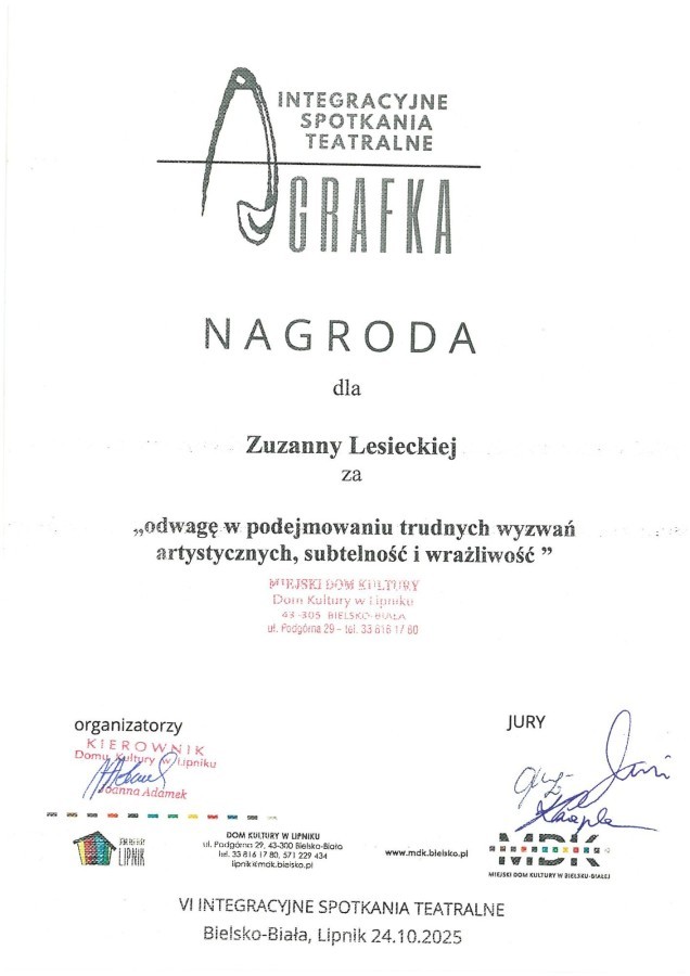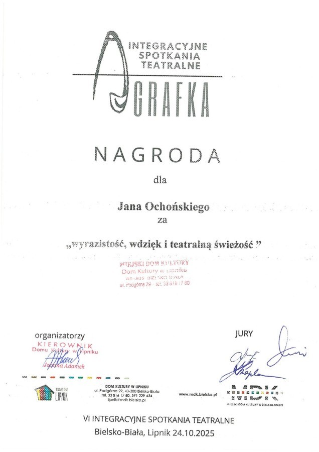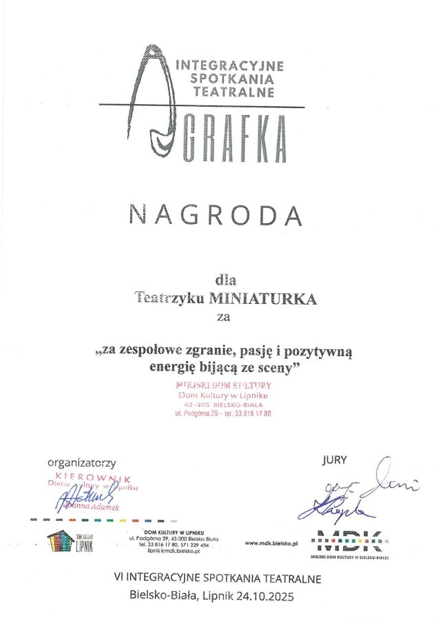 Zespół teatralny MINIATURKA za spektakl "Uwierz w siebie, czyli historia kotki Kłębuszki" oraz monodramiści z 3 klasy otrzymali finansowe nagrody od szanownego Jury Spotkań Teatralnych. Jak napisano na stronach Domu Kultury LIPNIK: cyt. "Teatr znów połączył ludzi — młodych, wrażliwych, odważnych". Podczas tegorocznej AGRAFKI scena stała się po raz szósty miejscem spotkania dzieci, młodzieży i zespołów integracyjnych, które udowodniły, że sztuka nie zna granic. Było wzruszająco, pięknie i prawdziwie. Dziękujemy profesjonalnemu Jury w składzie: Karolina Czapla, Eugeniusz Jachym, Władysław Aniszkiewicz — którzy z sercem, z czułością i uwagą ocenili młodych artystów. AGRAFKA to dowód na to, że scena jest miejscem, gdzie można powiedzieć o świecie coś prawdziwego. Za odwagę. Za wrażliwość. Za piękno."